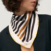 Este pañuelo cuadrado de seda presenta un diseño de rayas inspirado en las tradicionales sombrillas que bordean la costa mediterránea. El pañuelo de Med Stripe es una pieza de declaración audaz que se puede llevar alrededor del cuello, en la cintura, como un top o como un pañuelo en la cabeza.